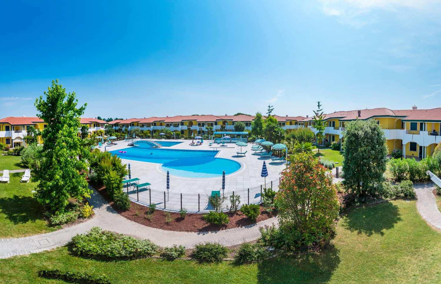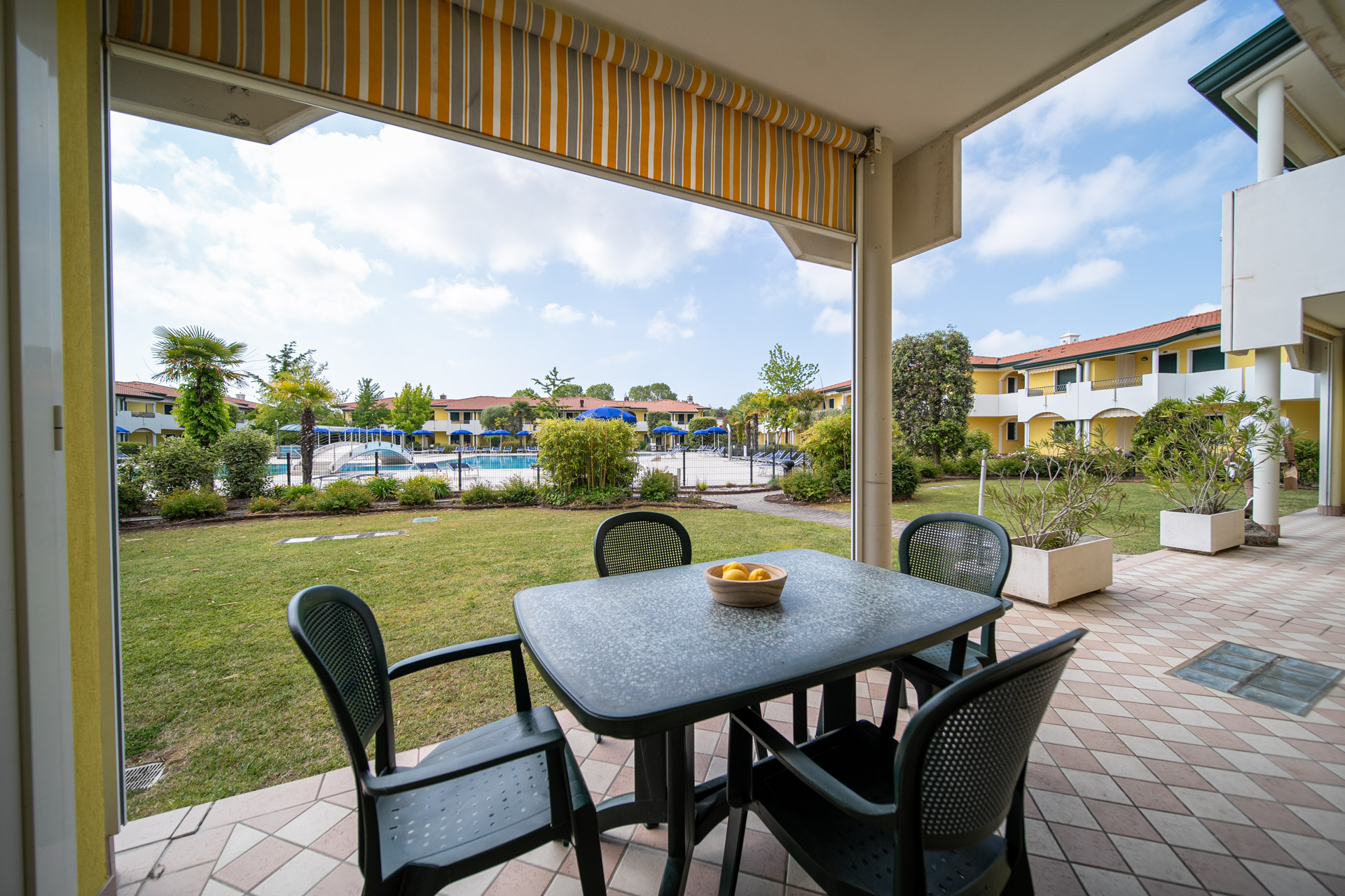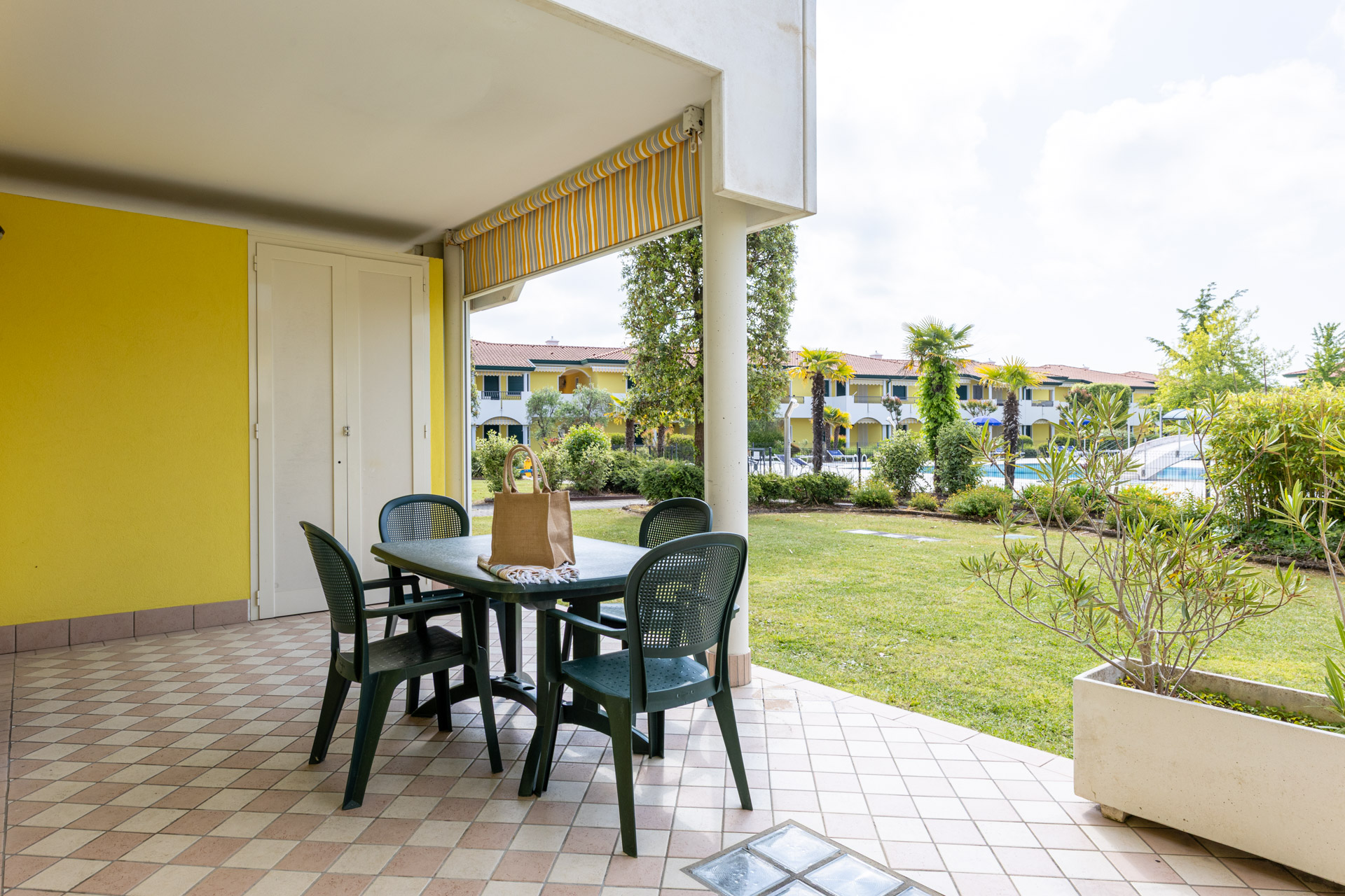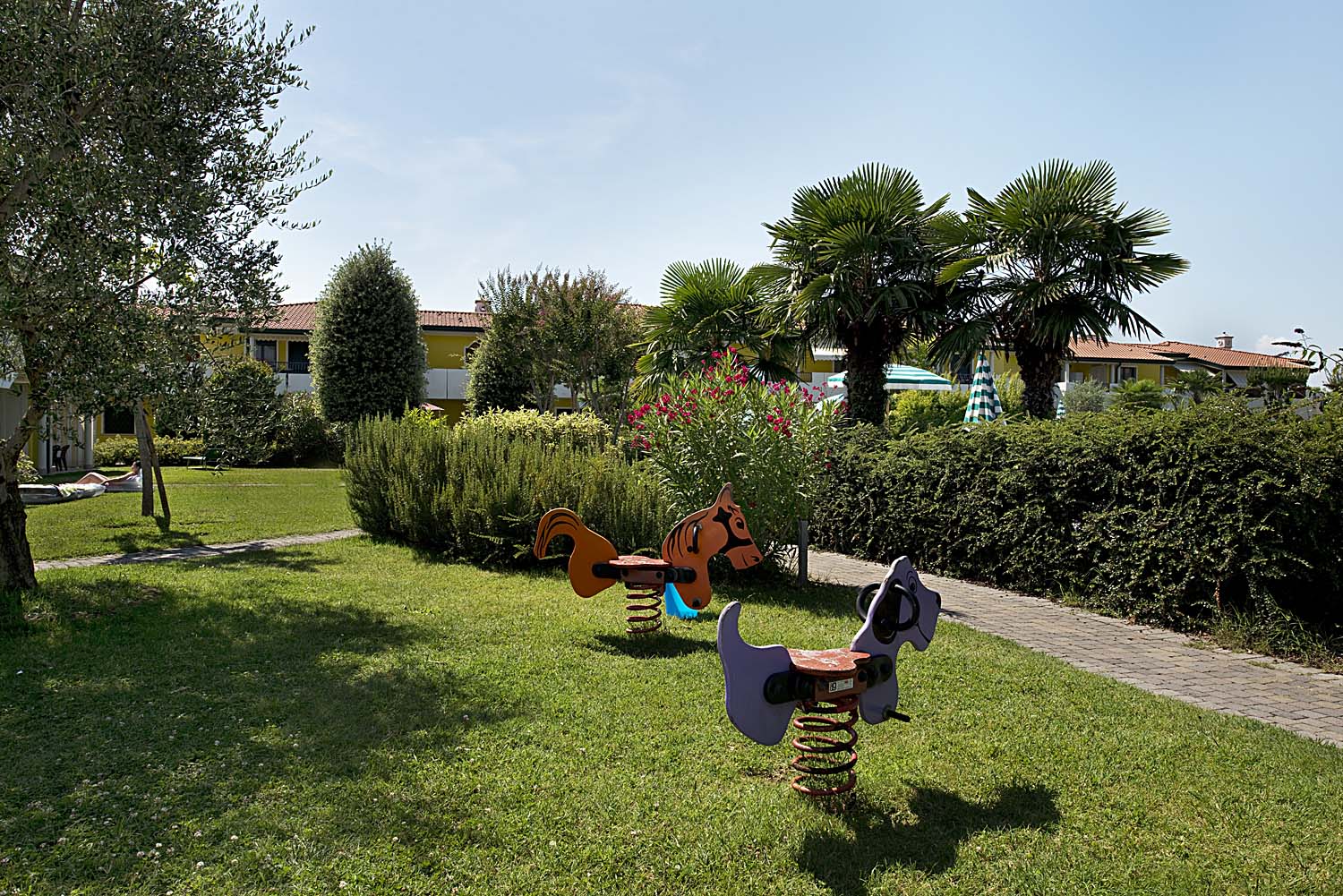 Modern, comfortable and very refined terraced houses (built in 2002) with swimming pool for adults and children, one outdoor fireplace in common, playground for children, communal washing machines and outdoor private parking places. At request, to be paid extra, parking place in garage.